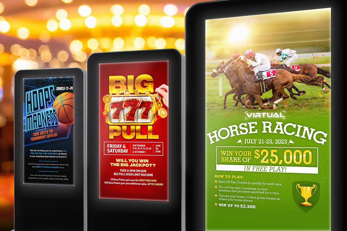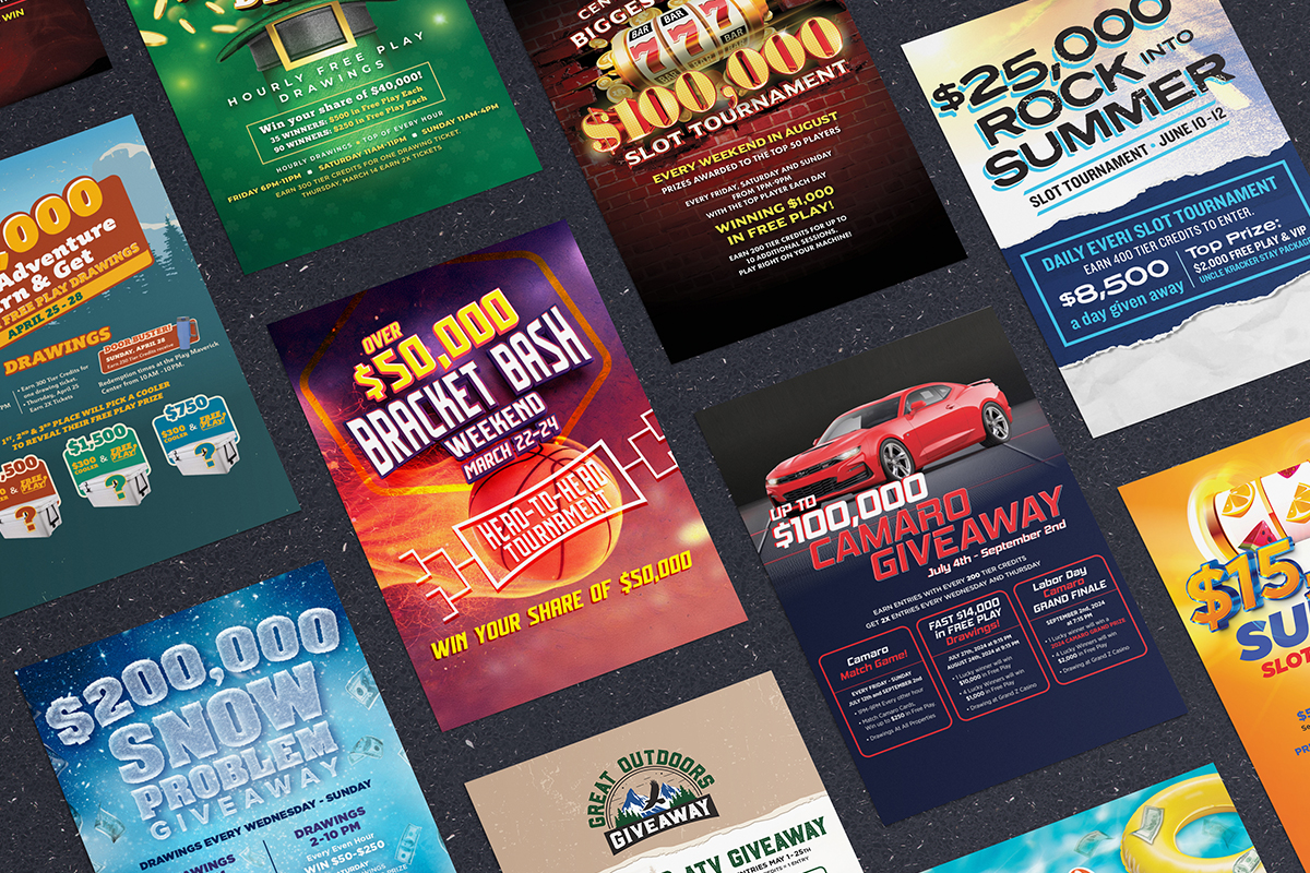 Full design campaign packages tailored to your casino’s specific needs. Whether it’s a concert, slot tournament, VIP party, holiday promotion, or trade show, your event will be fully supported with cohesive property signage, digital screens, print materials, and themed player gifts to build excitement and drive strong guest turnout.